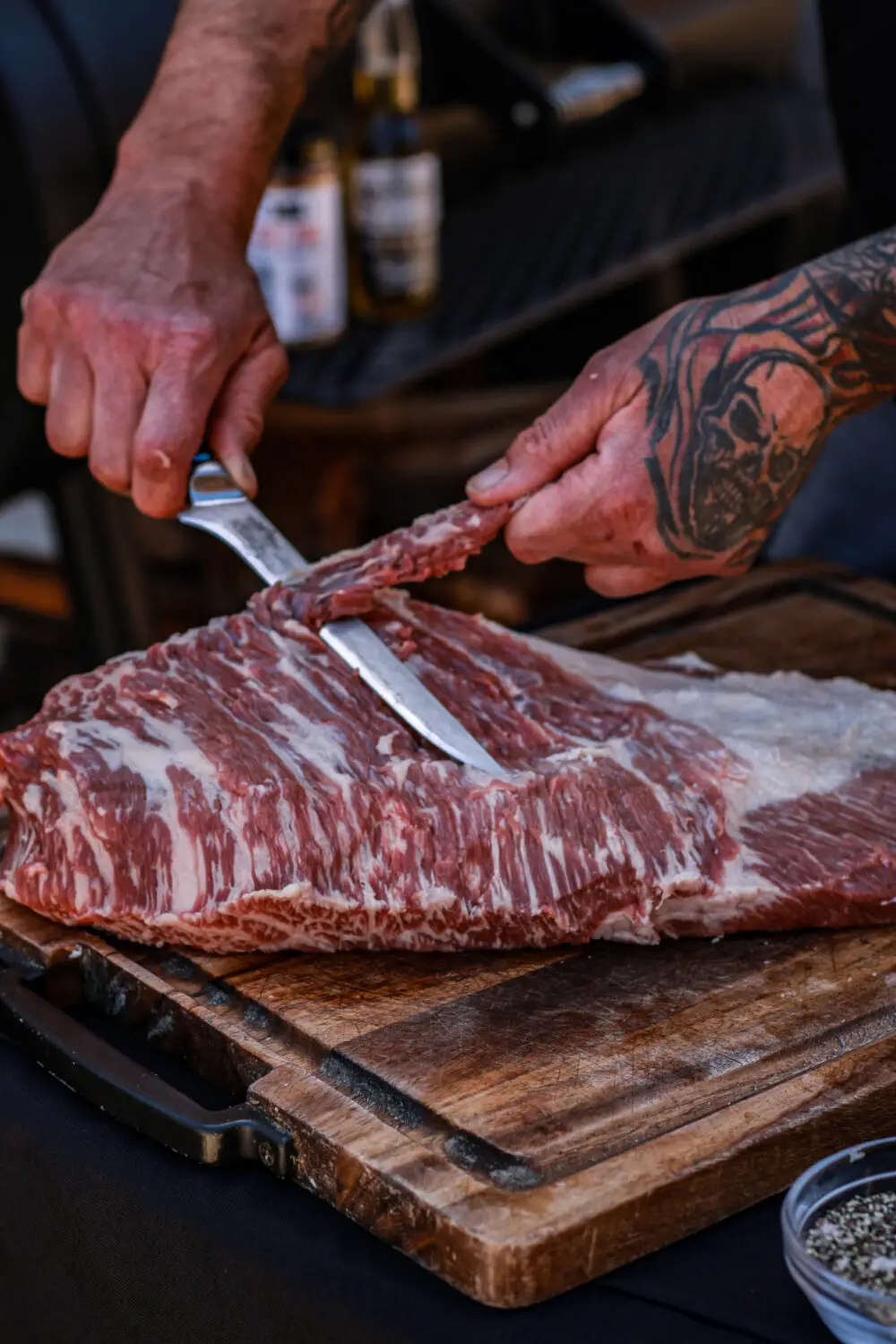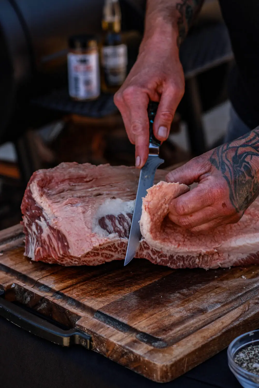 • The first thing you are gonna want to do is trim the fat. Now there is a great debate about fat cap on or off, how much to leave, how much to take, etc. So for the brisket I go with quite a bite of fat ribbons and opt to remove most of the fat and silverskin. Now I also will leave a trimmed fat cap depending on leanness of fat throughout the brisket. At this time you will also want to shape your brisket removing any part of the meat that is super thin and will over cook. Remove all silverskin. At this point, you may notice quite a bit of weight has been removed and you will need to adjust your cook times accordingly.