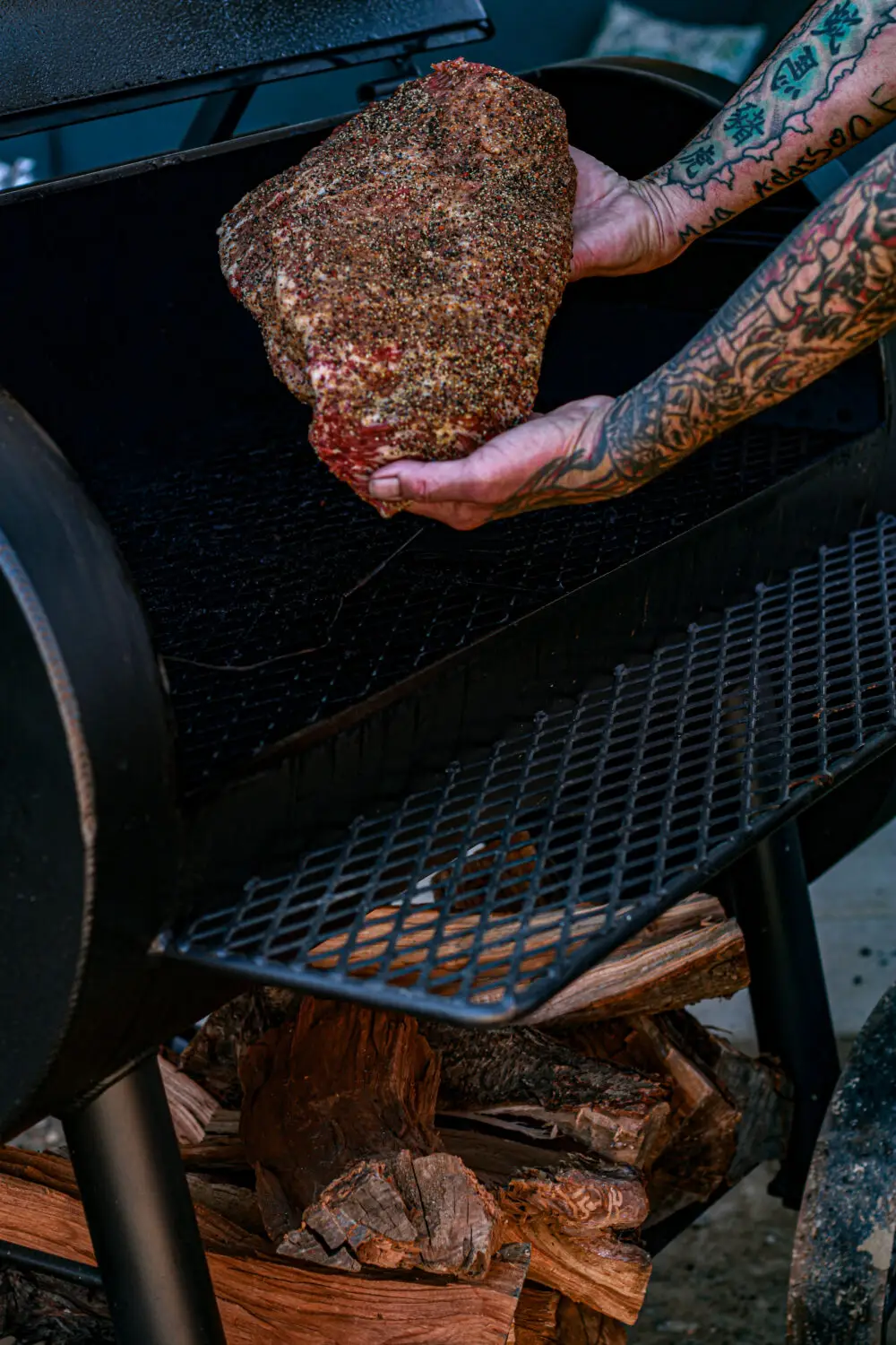 Tattooed hands hold a seasoned brisket above a smoker grill, ready for BBQ cooking.